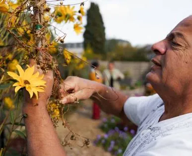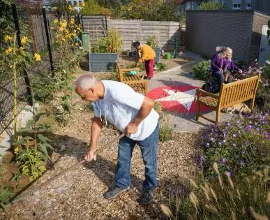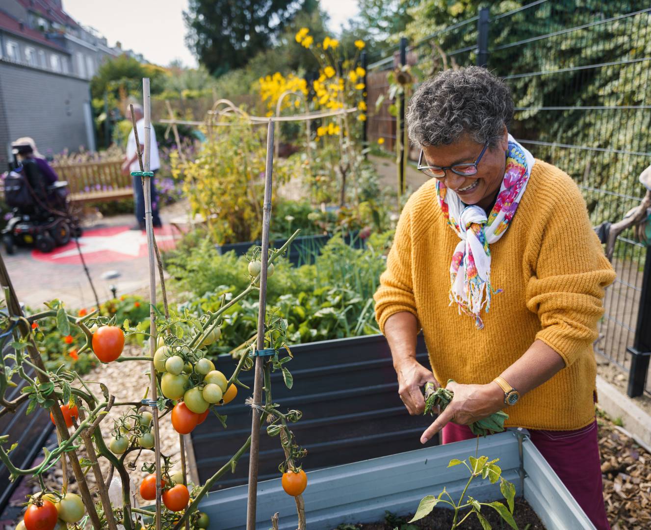 Samen met omwonenden is de tuin ingericht. Aan de ene kant staat groente. Geplant in bakken van ruim een meter hoog, zodat ze makkelijker te onderhouden zijn.